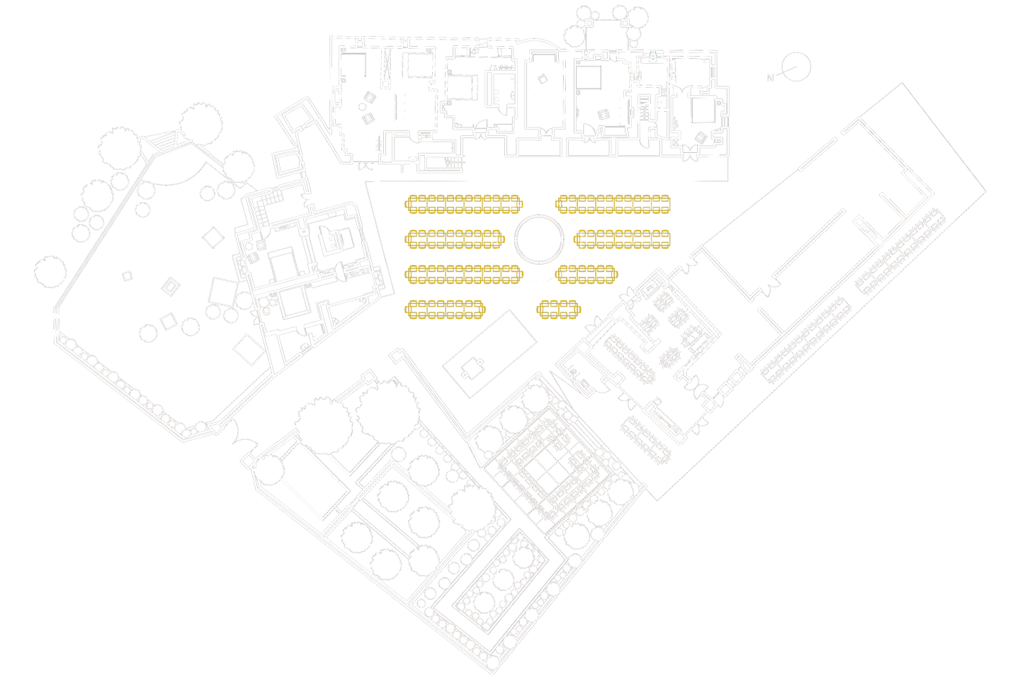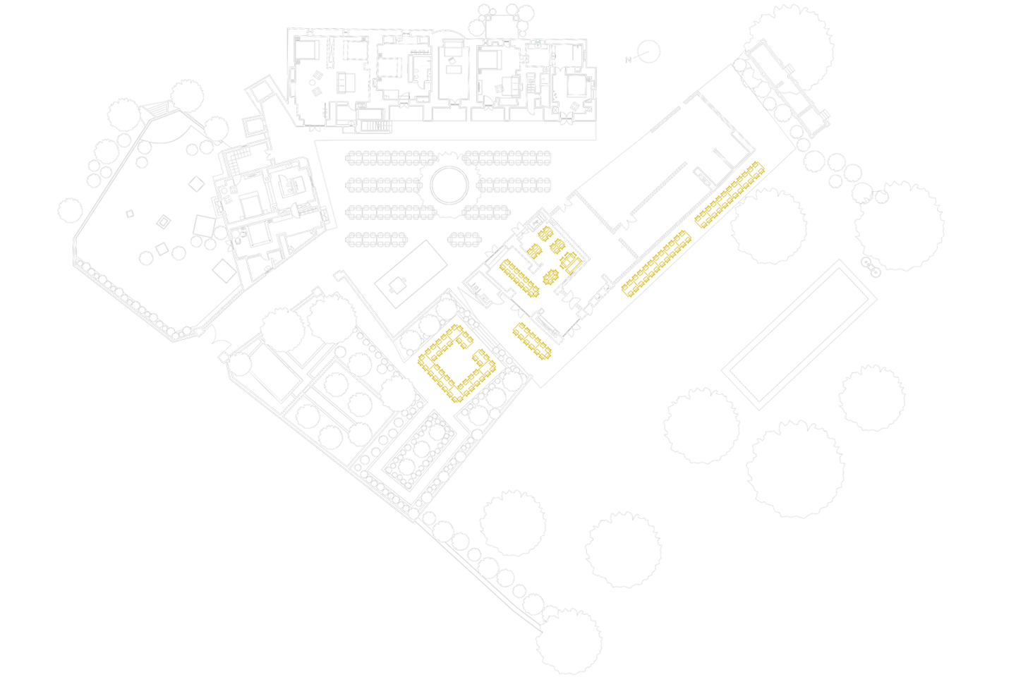 Bestuhlung bis 164 Sitzplätze Fläche ca. 346 m2 Tischgröße 150/100 cm Untergrund Kies